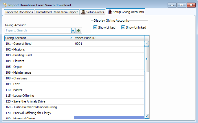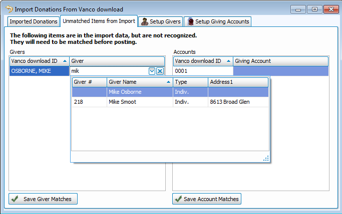 With the exception of Authorize.NET files, use the Setup Givers tab at any given time to link the unmatched information with Giving Accounts in Donations: