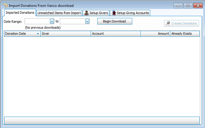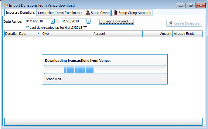 - Login to Vanco directly to import donations, first choose a date range and then click Begin Download: