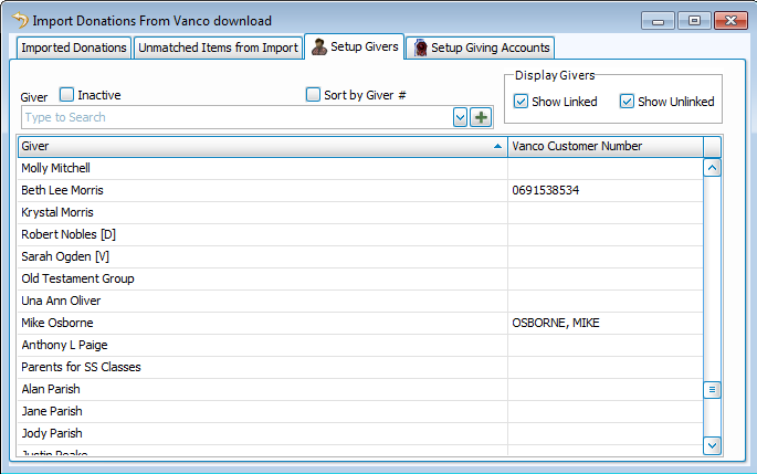 If you have Givers that opt to use electronic transfer for the donations they make, you can use the Setup Givers tab at any given time to link the unmatched information with the Giver name in Donations: