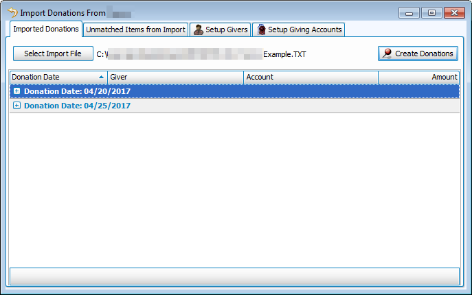 The Giver and Account names will only populate if the items have already been linked beforehand on the Setup Givers tab and the Setup Giving Accounts tab. Otherwise, you will first be prompted to link them on the Unmatched Items from Import tab.
