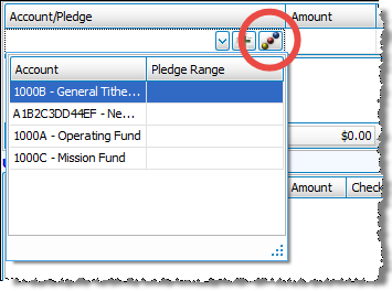When you Enter Donations, you have the option of making certain giving accounts appear towards the top of the Account / Pledge box. The Giving Account Order screen sets the order of appearance in which the accounts appear when the Accounts / Pledges dropdown is expanded.