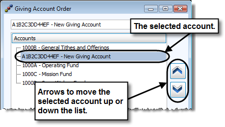 You can click the desired account once in order to select it. Then use the up and down arrows along the right side of the list of giving accounts to move the account in the desired direction.