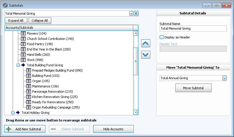 The list of Accounts / Subtotals always has in place a subtotal item that represents the total of all the subtotals you create that serves as a grand total. The subtotal item is originally called Total Giving Accounts, a name that you can change at any time. Click the  expand button to the left of each row to view details (when expanded it will become a collapse button).