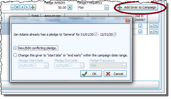 If a Giver already has a pledge during the campaign, a message will popup warning that there are conflicting pledges and asking how you wish to proceed: