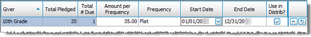 The Amount per Frequency, Frequency, Start Date, End Date, and Use in Distrib? Pledge Information Fields can be changed. Changing them will then recalculate the Total Pledged and Total # Due.