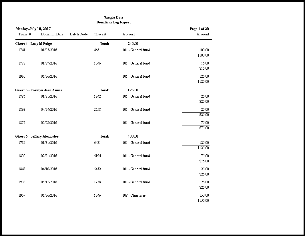 The Log Report (as well as the Donations Batch Report) shows all batches and the donations that were entered inside the batch.