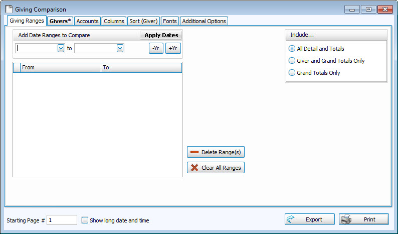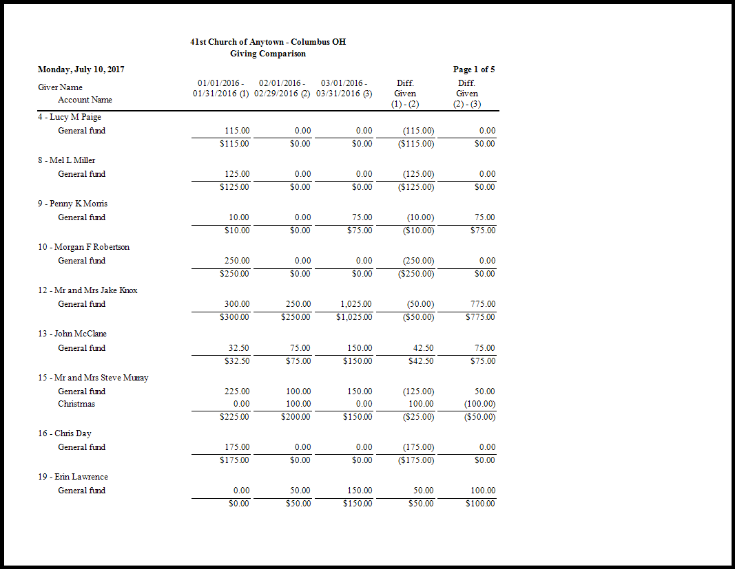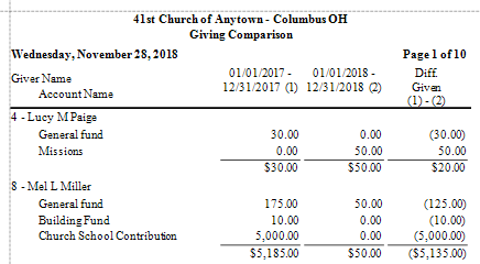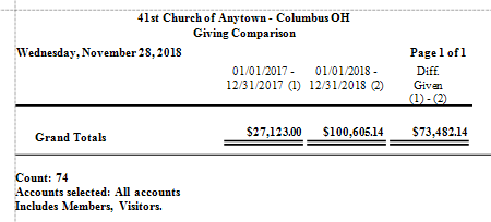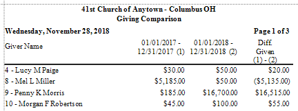 The Giving Comparison report is a listing of the similarities or differences in giving between specified time periods.