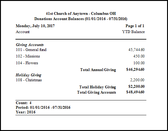Use the List Account Balances feature in Donations to generate a report that lists the balances for all the accounts.