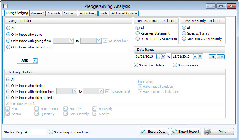 • Giving as a Family or Giving Separately — specify if you only want to see those who give alone or only those who give as a family.