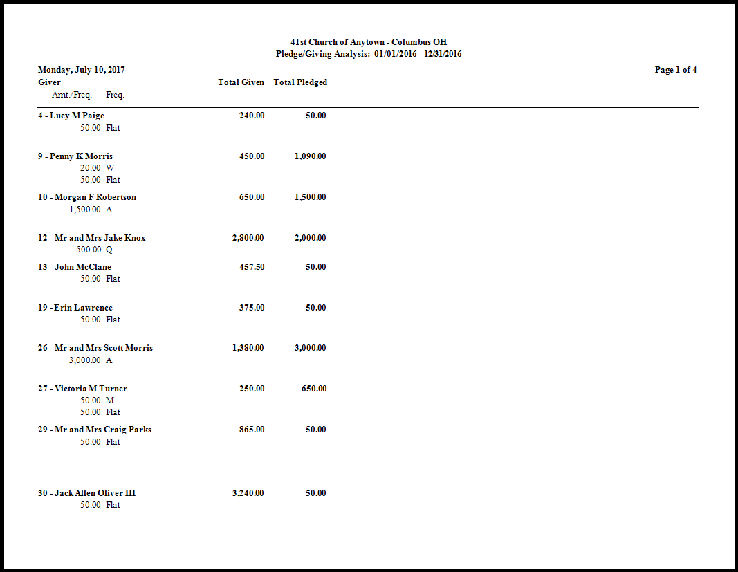 For each Giver, the Pledge / Giving Analysis presents a comparison of money given to Giving Accounts against money pledged to each one. This is also one of the most flexible reports in Donations.
