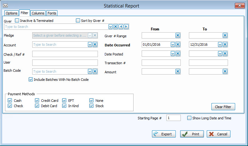 This is where you can choose certain Givers, Pledges, Accounts, Batch Codes, dates, even transaction numbers, amounts, and payment methods.