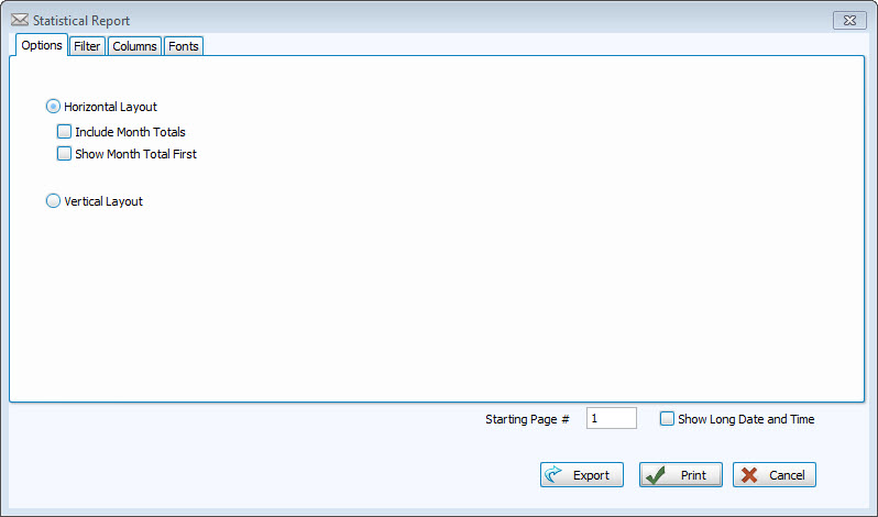 This will open up the Statistical Report screen to the Options tab. Here you can select if you want a Horizontal or Vertical layout. If you select a Horizontal layout, you can also choose whether or not to "Include Month Totals" and to "Show Month Total First":