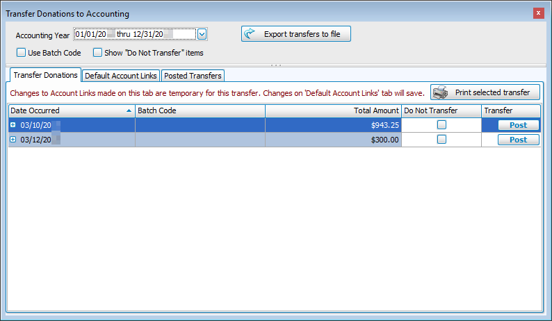 The batch you posted in the Transfer Donations list will disappear. Click the Posted Transfers tab to locate the batch you just posted and print if necessary.