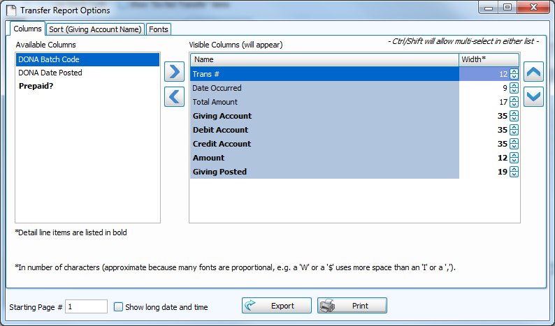 Use the Transfer Report Options screen to print a report about batches in Donations either before or after you Transfer Donations to Accounting.