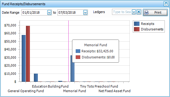 This bar graph compares the Receipts and Disbursements for each fund, or select a single fund from the Ledgers dropdown:
