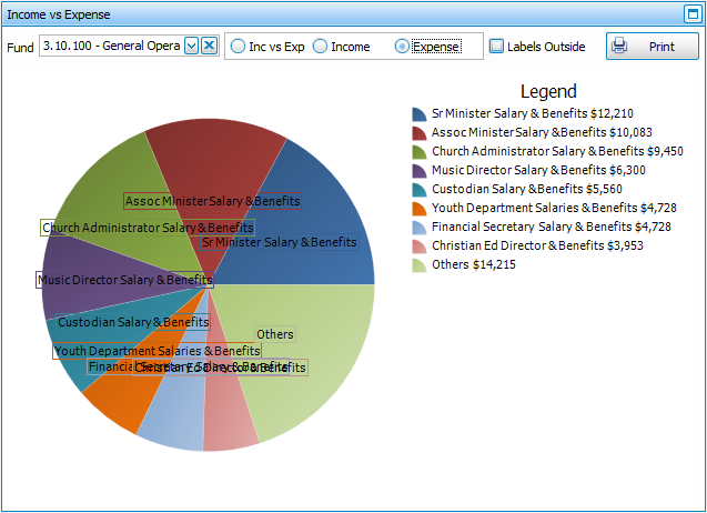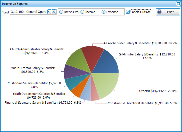 This pie graph provides three display choices for your Funds. Select a Fund from the dropdown and then choose to view either: