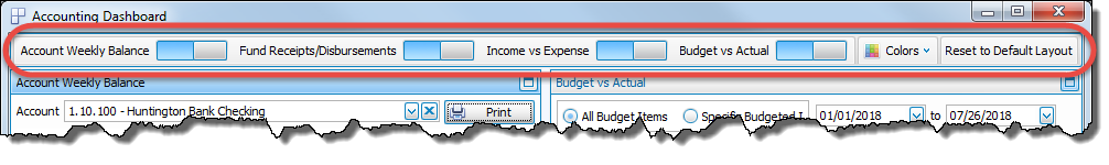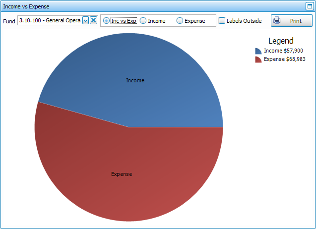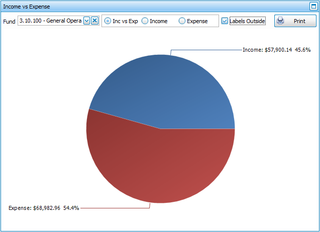 Four types of graphs are available to view and/or print a visual comparison of various information about the Accounting Transactions, Account Balances, and Budgets recorded in your database. The available graphs are: Account Weekly Balance, Budget vs. Actual, Fund Receipts / Disbursements and Income vs. Expense