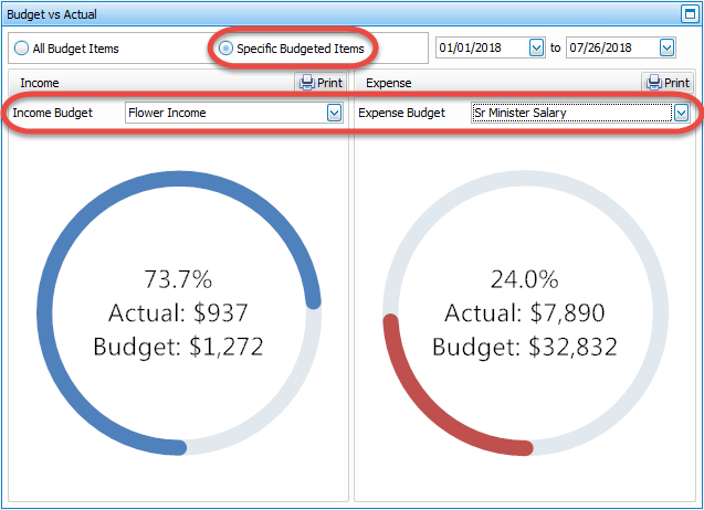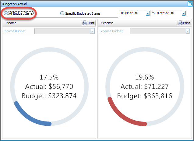 Choose a date range in the top right to compare your actual Income and Expense to your Budgets for either all or only a selection of your budgets: