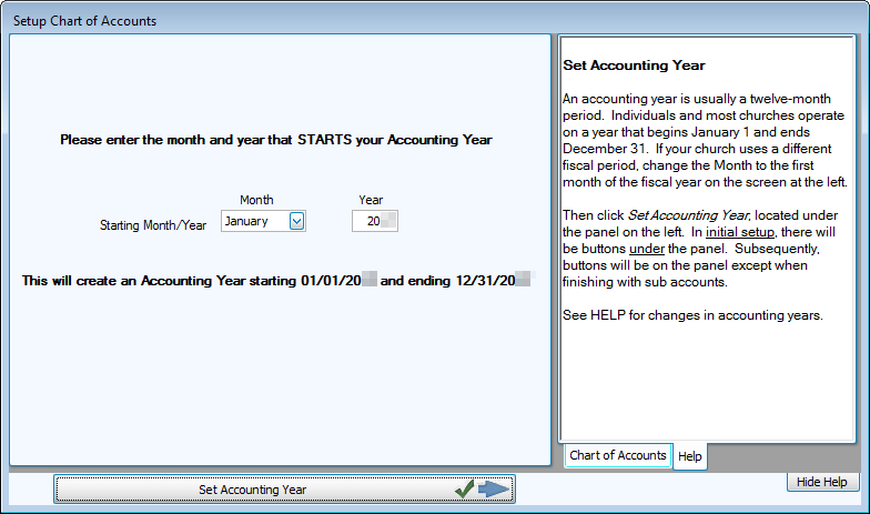 The first step is to define the Accounting Year, or fiscal year, by entering the month on which it begins in the current year. The Chart of Accounts, the Budgets and Budget Projection amounts, and the Transactions you save and post to the accounts are kept track of in an Accounting Year that must be set up and managed from one year to the next.