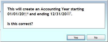 • A message will prompt you that "This will create an Accounting Year starting [on the first day of the chosen Month and Year] and ending [on the last day of the one-year period]." The message will also ask you "Is this correct?"