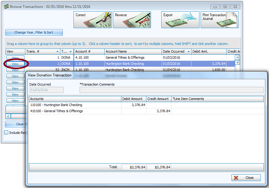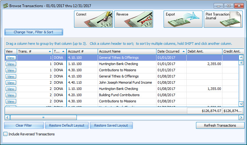 Every transaction that is either transferred to, or entered from within the Accounting Module can be found on the Browse Transactions screen. Use the features on the Browse Transactions screen to locate, reverse, correct, or print any set of transactions. Transactions can also be exported to a file, which can be saved to disk and sent by email.