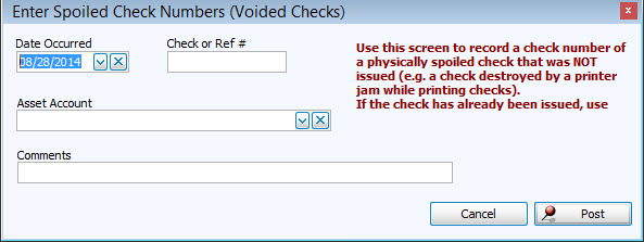 - Choose "Enter Spoiled Check Numbers (Voided Checks)" and the window will open: