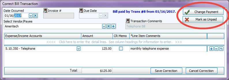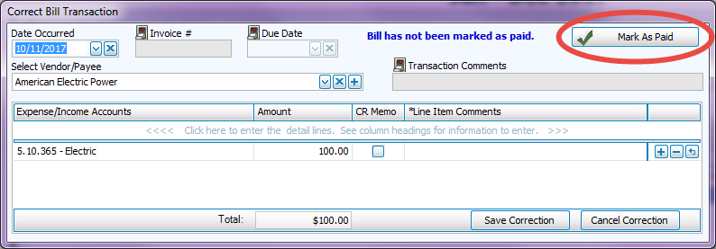 - To mark unpaid bills as paid from the Correct screen, click the button and following the prompts: