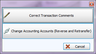 If you are correcting a Donations transaction, you will get an initial screen asking if you want to change the comment on the transaction (in which case it will not need to be reversed) or correct the accounts used. If the accounts need corrected, it will be reversed and re-entered for you, and it will tell you the new transaction number.