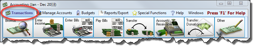 Enter the money transactions affecting the Chart of Accounts of your Church by using the Transactions menu option. Then, choose the feature pertinent to the type of transaction you are posting:
