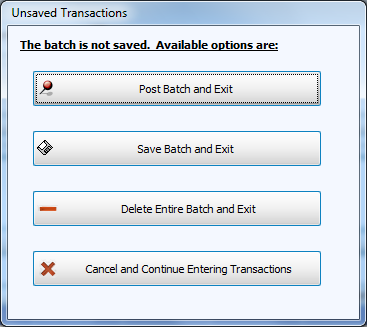 While entering batches of any of these types of transactions, if you try to close the window before posting or saving, you be presented with the following options: