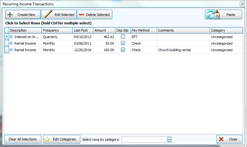You can also assign categories to your Recurring Transactions by using the features found when clicking the Edit Categories button. You can also Select rows by category using the box at the bottom of the screen, according to assigned categories. Click Clear All Selections to start over with making selections.
