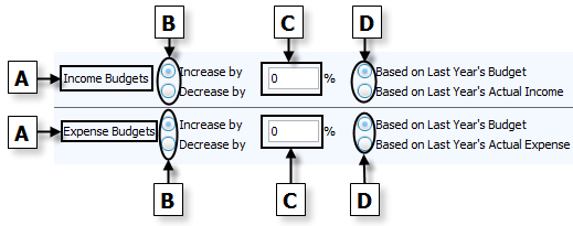 - Then choose between adjusting your selections based on (D) either last year's budget or last year's actual Income / Expense.