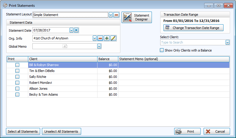 checkmark in the Print box next to each statement you wish to print. You can click the buttons at the bottom of the screen to Select All Statements, or Unselect All Statements. - You can also use the Select Client box at the top right to individually mark the name of each selected client with a check.