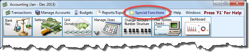 Through the options in this menu you can do a Bank Reconciliation, Link Donations to Accounting for transferring to Accounting, Manage Years, Change Account Number Structure, and work with Prior System Checks. The menu also contains a Settings feature that gives you a panel where you can apply default Accounting Settings for the various screens throughout Accounting.