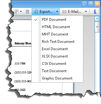 This button allows you to save the report in one of several standard formats for use in other programs. Click the down arrow to choose the file format you would like to Export to. The type of file you choose should be determined by the other software with which you want to use the data. You will then see a form that allows you to adjust the settings, if needed, and then choose a name and a location for the file.