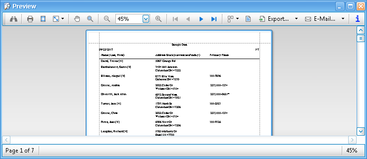 Throughout Church Windows whenever you click the "Print" button it will always take you to a preview screen so that you can see what the document will look like, before you actually print it out. Across the top of this screen is a toolbar where you can choose the final formatting options for your report.