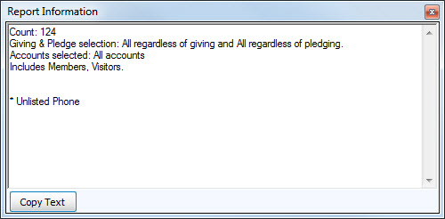 This button is a quick way to get Report Information including a count of how many total items are on the whole report as well as a breakdown of the criteria you used for creating the report itself (this information is also displayed at the very end of most Membership and many Donations reports):