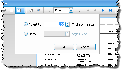 Click to adjust the size of the report on the page when you print it. You can scale up or down by percentage or you can set it to print more than one page of the report per piece of paper: