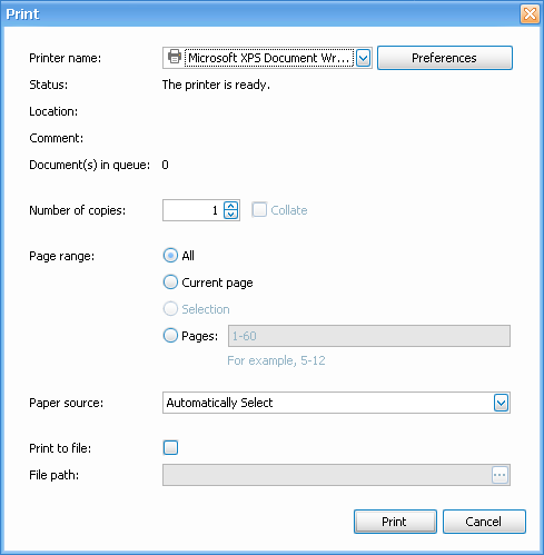 that allows you to choose your printer and number of copies and page range as well as a button to access the Preferences for your specific printer. If you have more than one printer available to